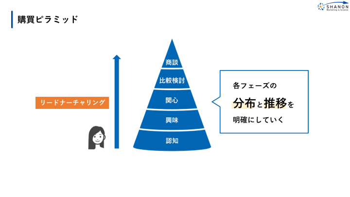 SMPの導入により、メンバーはメール配信、Webセミナーの開催といったマーケティング活動に着手し、MAの基本的な考え方を徐々に身に付けていった。シャノンが提案しているフレームワークとして、顧客の購買行動を「認知、興味、関心、比較・検討、商談」というフェーズで管理する「購買ピラミッド」がある。それぞれの取り組みは、このフェーズ管理の仕組みを利用して円滑に行われた。
